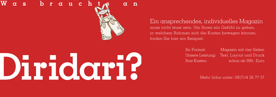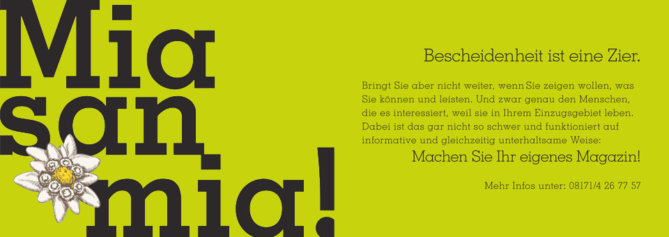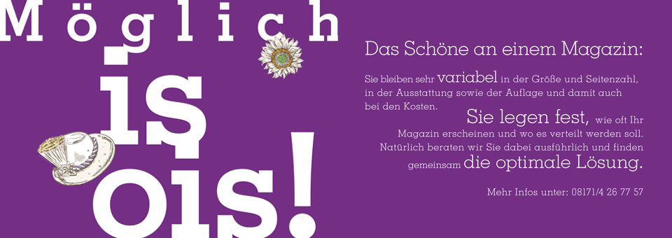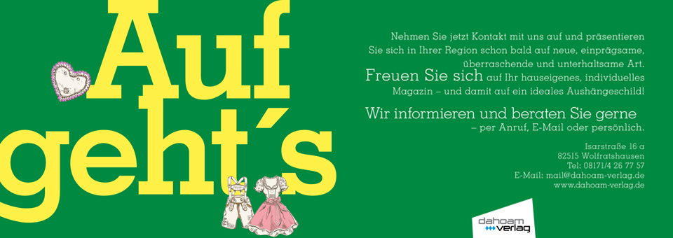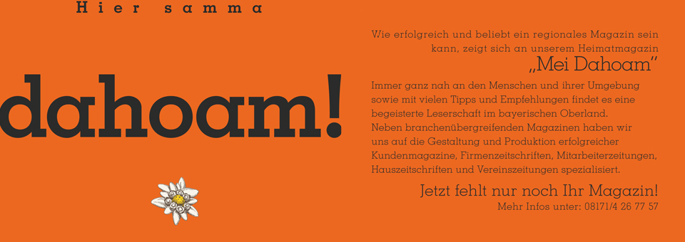 Der Dahoam-Verlag in Wolfratshausen hat sich auf die Produktion und Gestaltung von Kundemagazinen, Hauszeitschriften, Firmenzeitungen, Vereinszeitschriften und Mitarbeiterzeitungen,